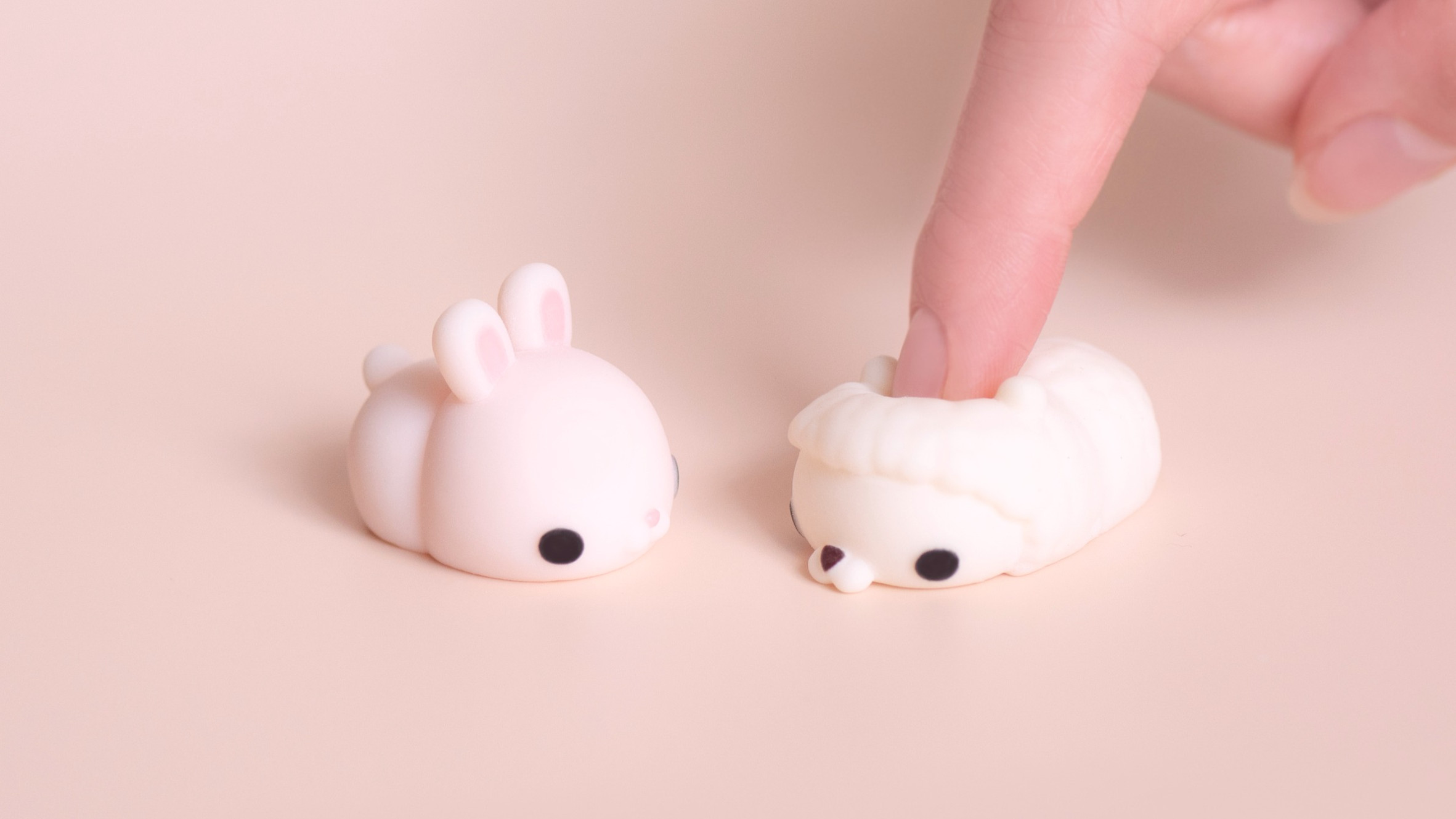 一方の「もにまるず」は、つきたてのおもちのように、絶妙でやわらかい感触が特徴で大人の女性を中心に大人気の動物キャラクターフィギュア。