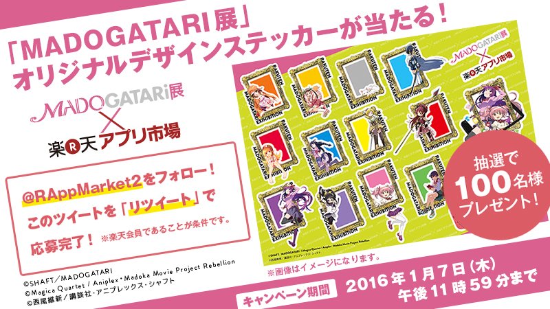 マドガタリきせかえ★LINEランチャーの配信記念を祝して、楽天アプリ市場Twitterをフォローして、対象ツイートをリツイートすると、楽天アプリ市場限定MADOGATARI展ステッカーを抽選で100名様にプレゼント! [キャンペーン期間:~1月7日]