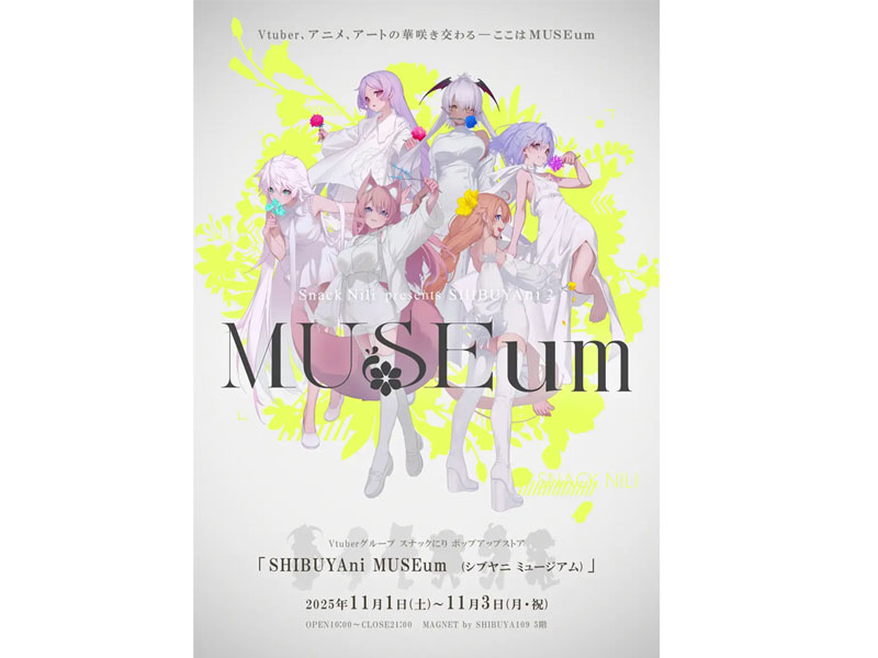 大人気イラストレーター・ニリツ先生が主宰するVtuberグループ「スナックにり」が、新たなポップアップイベント「Snack Nili presents SHIBUYAni MUSEum」の開催を決定しました!2025年11月1日(土)から3日(月・祝)の3日間、MAGNET by SHIBUYA109の5階イベントスペースA-MECが、最先端のアート空間に生まれ変わります。