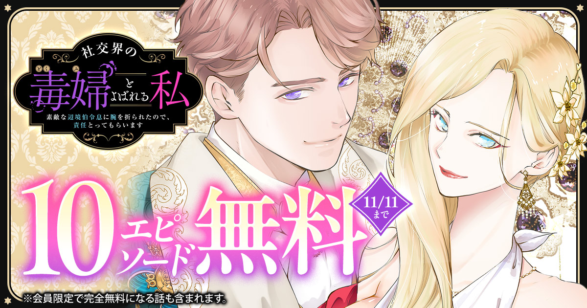 白泉社は、霜月かいり(作画)×来須みかん(原作)による話題作『社交界の毒婦とよばれる私~素敵な辺境伯令息に腕を折られたので、責任とってもらいます~』の人気作品キャンペーンを実施します。期間中、ヤングアニマルWebにて第1話を含む10エピソードが無料で公開されます(会員限定で無料になる話を含む)。配信は期間限定で、11月11日(火)までとなっています。