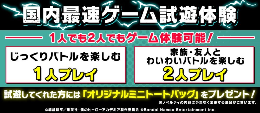 国内最速でヒロアカ対戦アクションが楽しめます! 今回の試遊台では「1人プレイ」または「2人プレイ」が選択可能。1人でも、友達や家族とでも楽しめます。