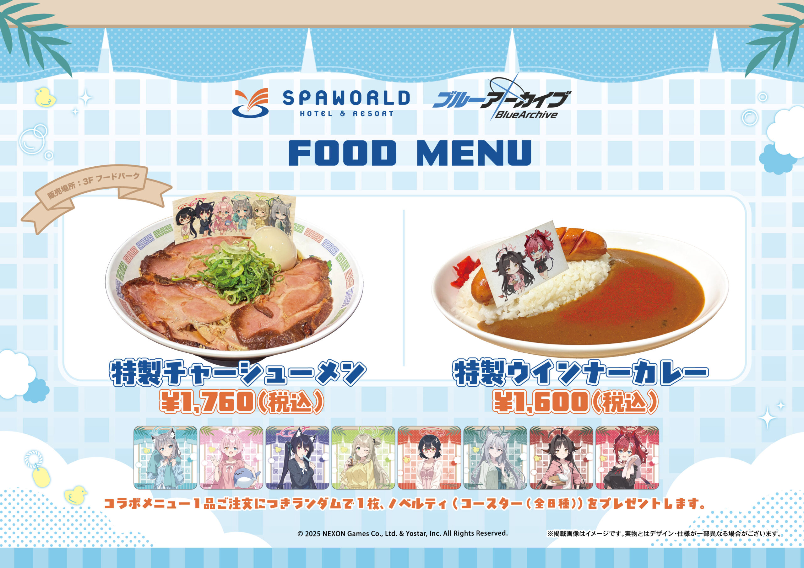 イベント期間中、館内フードエリアにてコラボレーションメニューが販売されます。 「特製チャーシューメン」や「特製ウインナーカレー」といったフードメニューのほか、全8種のドリンクが登場。 コラボメニューを1品ご注文につき、ランダムで1枚ノベルティがもらえます。