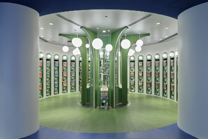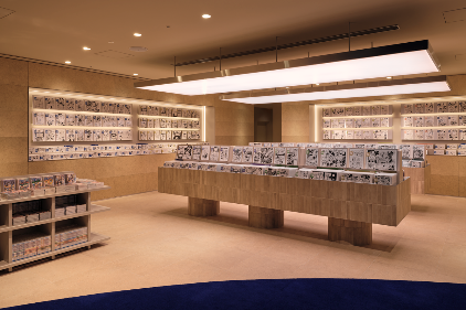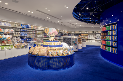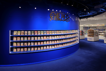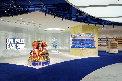 ショップ内は深淵のブルーを基調とし、ルフィたちが冒険してきた島々を彷彿とさせるエリア分けがなされています。広大なフロアには、このショップのために開発された新商品が約500アイテムも並ぶとのことです。