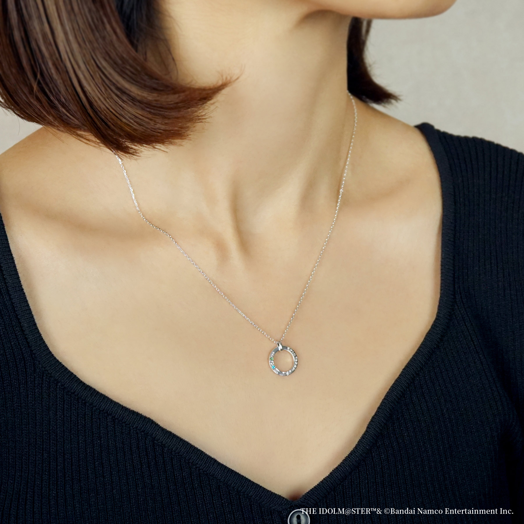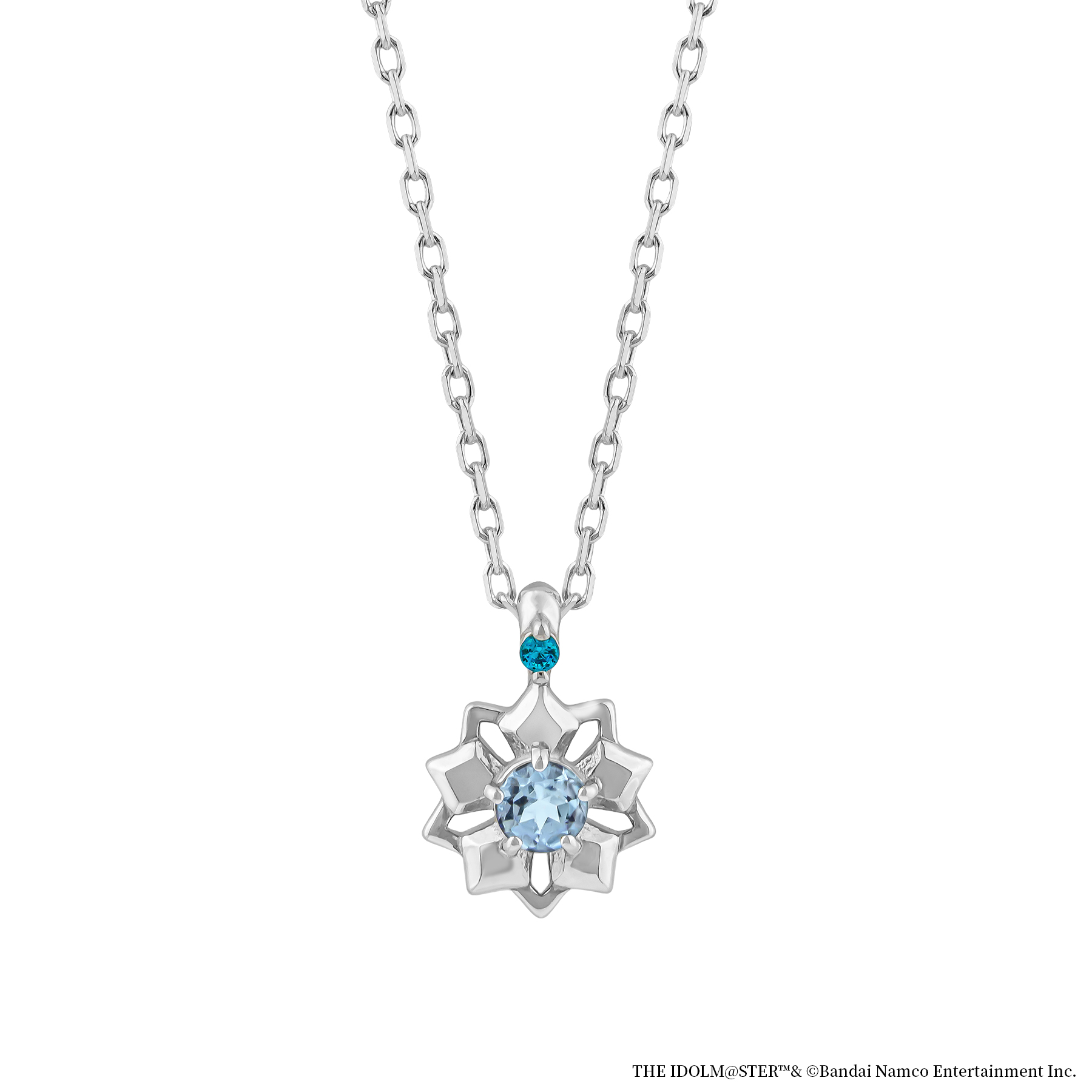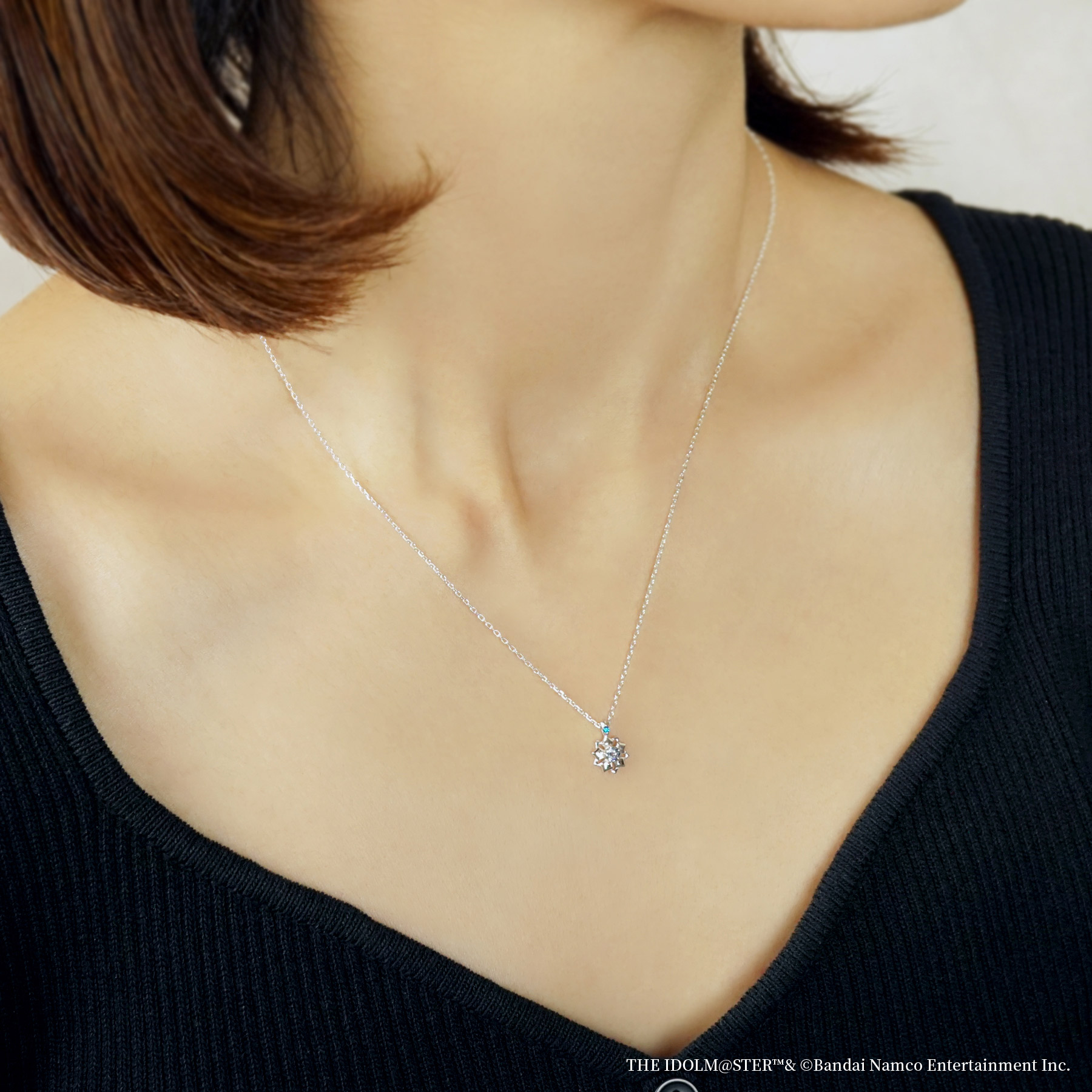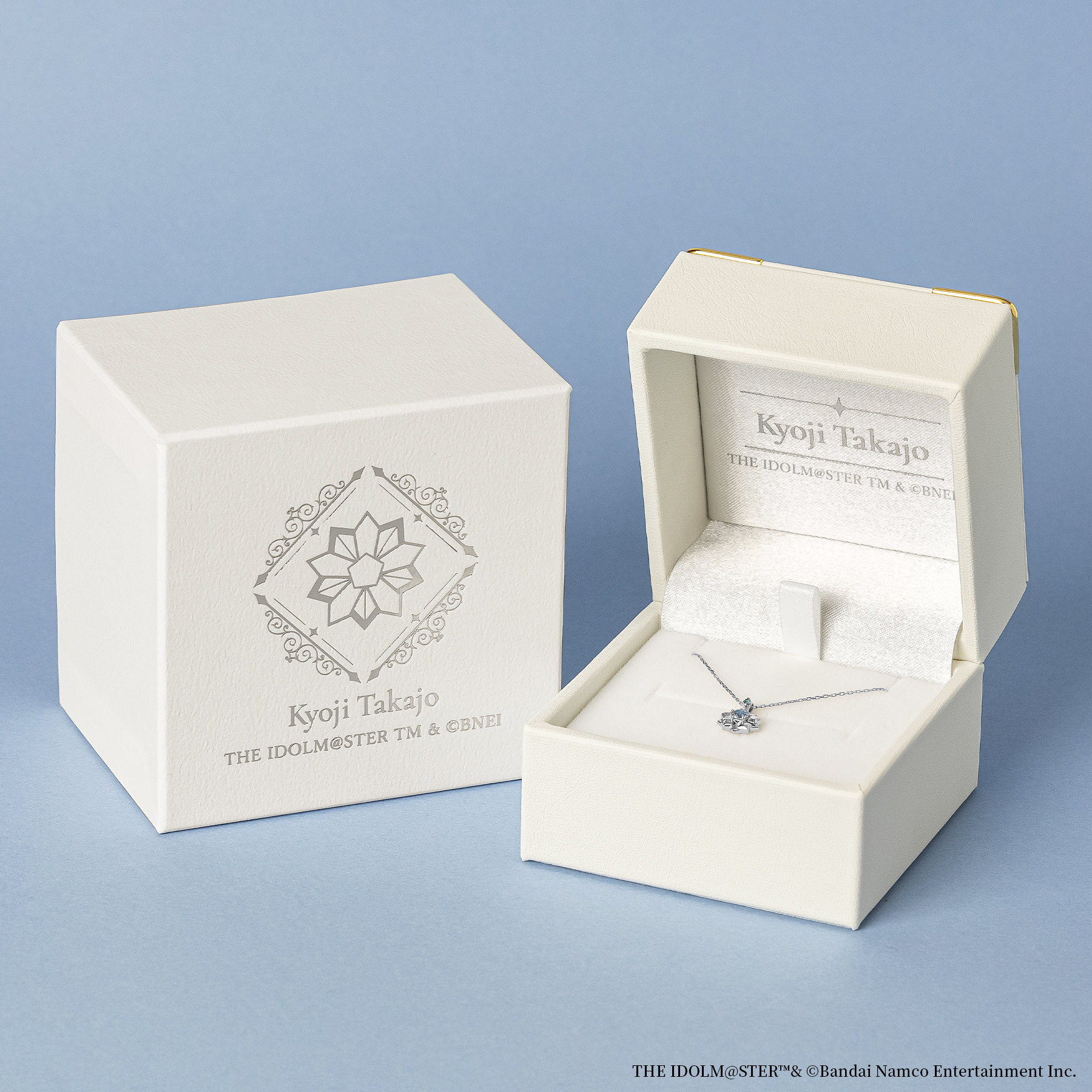 もう一つのラインナップは、イラストで着用している首元の装飾をモチーフにした「鷹城恭二イメージネックレス」です。 繊細なシルエットと2種類のブルーのストーンで、鷹城恭二の落ち着きと芯の強さを表現しています。優しい透明感と深い輝きは、自らの力で未来をつかもうとする彼の情熱と端正な佇まいを連想させます。 こちらはシルバー素材とプラチナ素材の2種類が用意されており、プラチナモデルにはブルーダイヤモンドがあしらわれています。