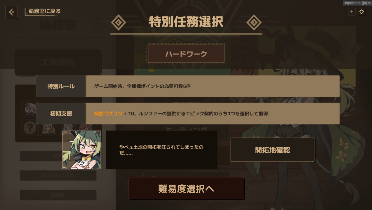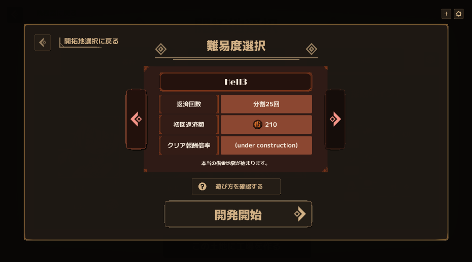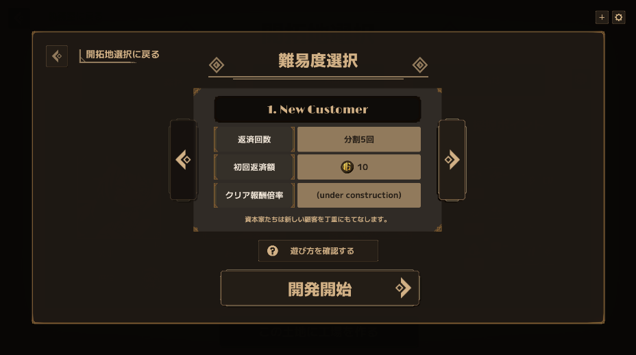 難易度は複数用意されています。製品版では段階的に解禁される仕様となる予定ですが、今回のプレイテストでは最初から全ての難易度が選択可能です。初心者の方は、借金額が少なく仕様を覚えやすい「New Customer」から始めることをお勧めします。腕に自信のある方は、最高難易度「Hell3」に挑戦してみてください。高難易度では借金額が増加し、ゲーム内の機能も制限されます。