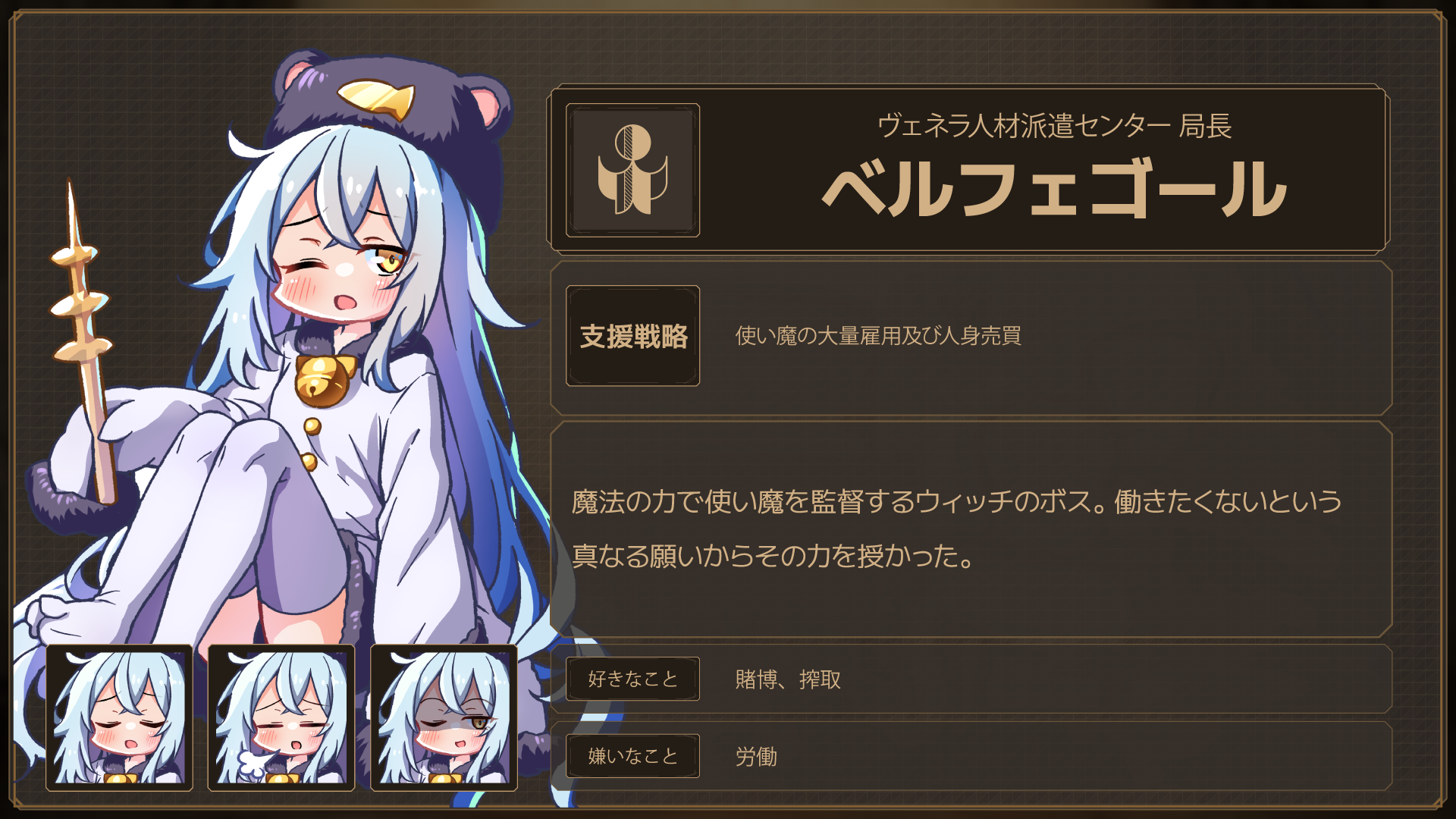 地獄開発機構 総裁「ゲヘナ」 コキュートス建設 CEO「ルシファー」 地獄中央銀行 頭取「マモン」 オフィーディア化学研究所 所長「レヴィアタン」 ヴェネラ人材派遣センター 局長「ベルフェゴール」