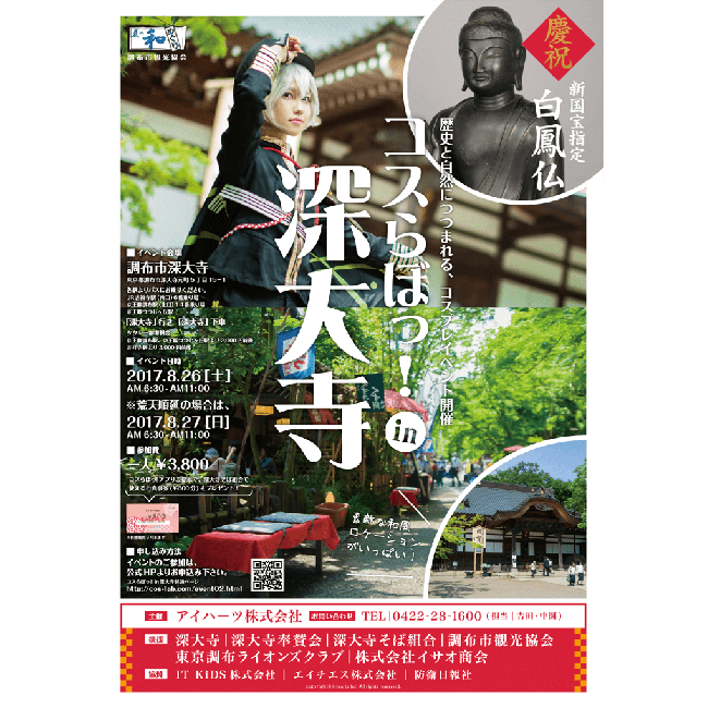 コスプレ 【コスらぼっ!】主催イベント「コスらぼっ!in 深大寺」8月26日(土)開催!!東京とは思えない「小京都」のようなロケーションで本格撮影を楽しもう♪ アイハーツ株式会社が運営するコスプレイヤーのための写真・SNS アプリ「コスらぼっ!」主催のコスプレイベント「コスらぼっ!in深大寺」が開催まで1ヶ月をむかえ話題が拡散中!!イベントは、8月26日(土)am6:30~am11:00に開催され... 2017.07.25 コスプレ